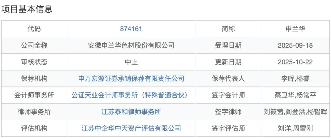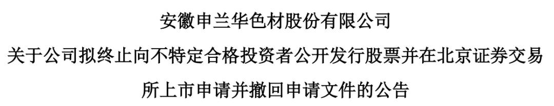 安徽申兰华色材股份有限公司(“申兰华”)于2026年3月16日召开第二届董事会第三次会议,审议通过了《关于公司拟终止向不特定合格投资者公开发行股票并在北京证券交易所上市申请的议案》和《关于撤回向不特定合格投资者公开发行股票并在北京证券交易所上市申请材料的议案》。